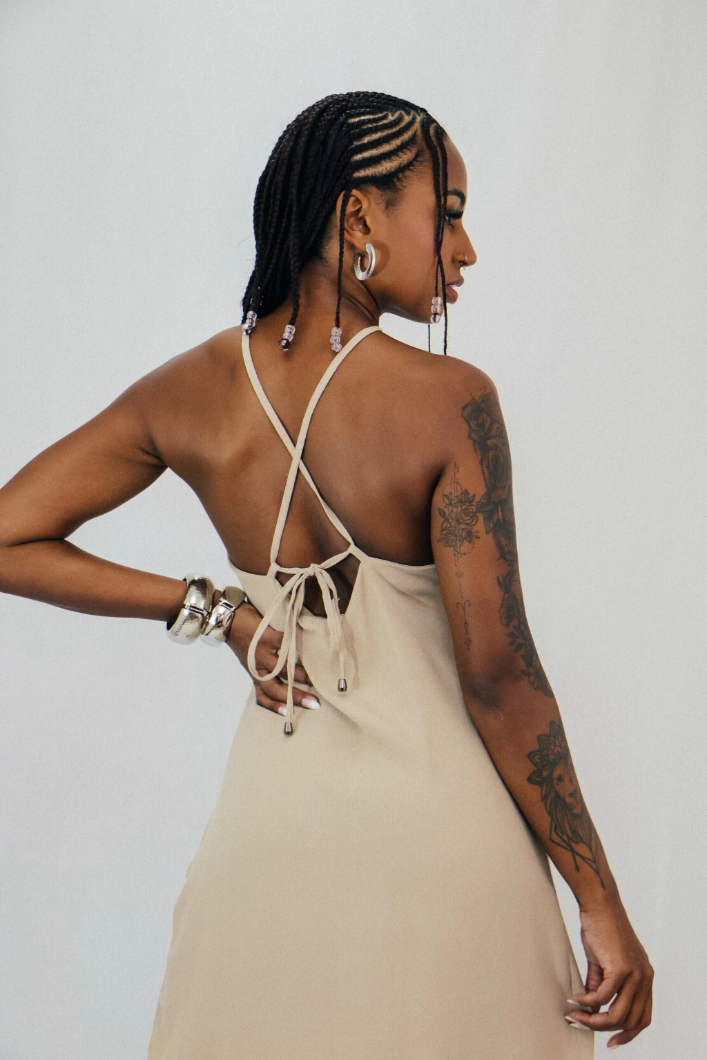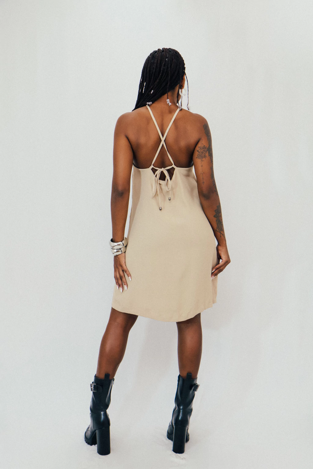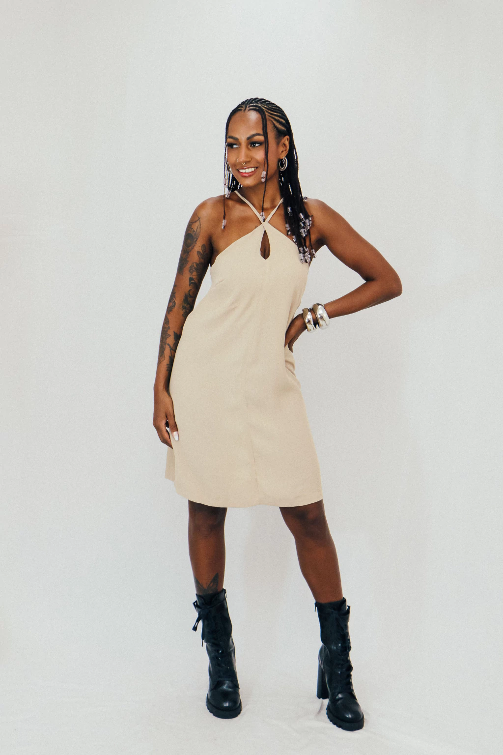 Vestido confeccionado em viscose, com decote transpasse e modelagem reta.
